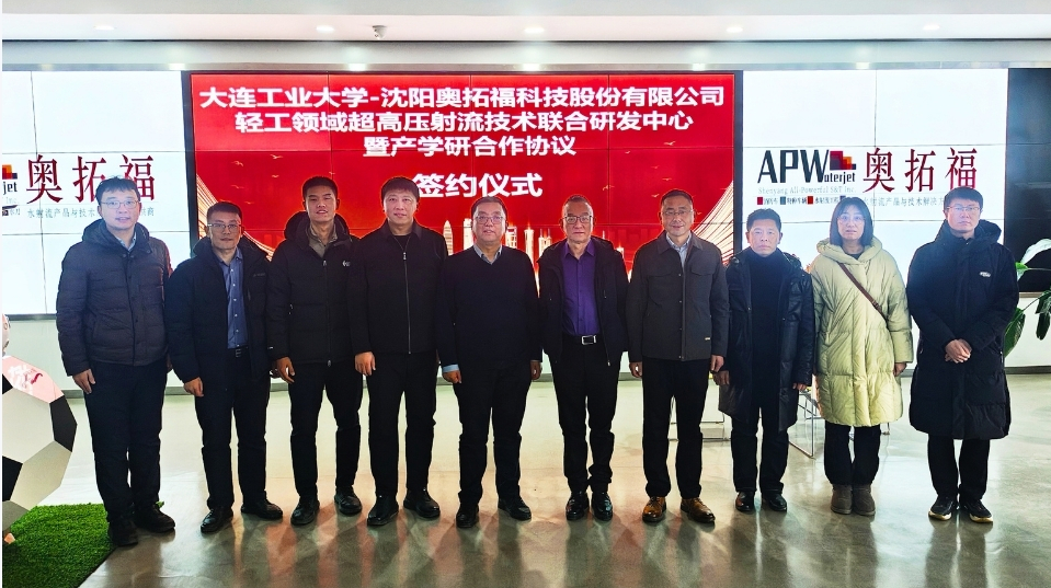 1月27日,大连工业大学与沈阳奥拓福科技股份有限公司在奥拓福公司会议室隆重举行轻工领域超高压水射流技术联合研发中心暨产学研合作协议签约仪式。大连工业大学机械工程与自动化学院院长庞桂兵与奥拓福董事长陈平代表双方签署合作协议,双方领导致辞并就合作细节深入交流,达成广泛共识,为轻工领域超高压水射流技术的创新突破与产业化应用奠定坚实基础。